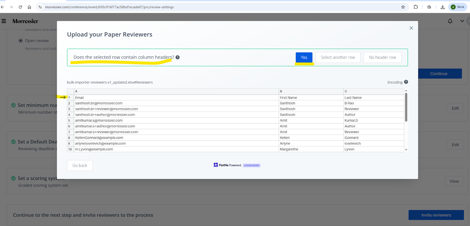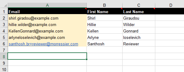 In the spreadsheet, add an email address, first name, and last name for each reviewer.