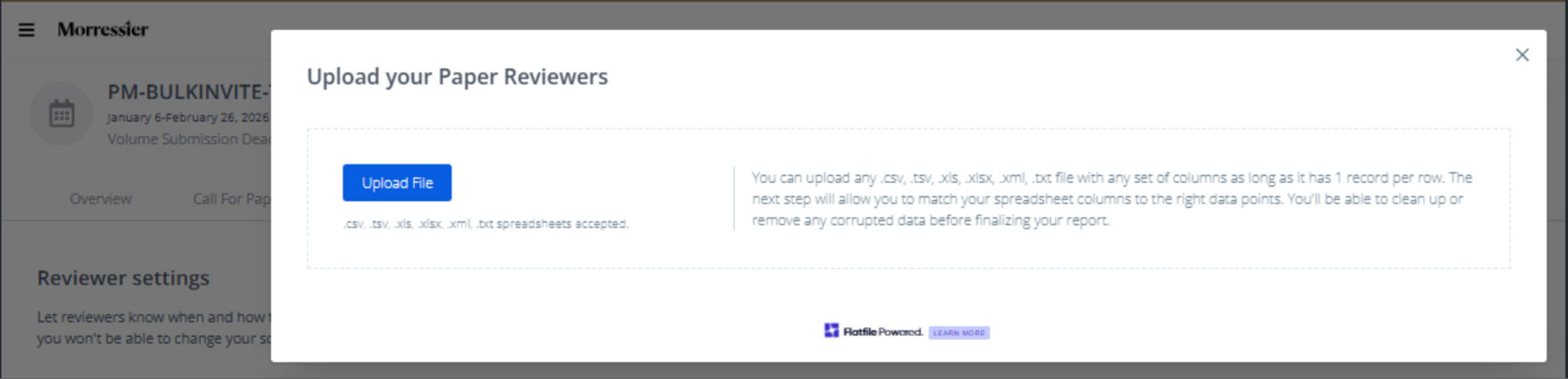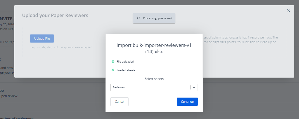Back in Proceedings Manager, you’ll see a prompt to upload your file. Organizers can upload reviewer information using a .csv or .xls(x) file.