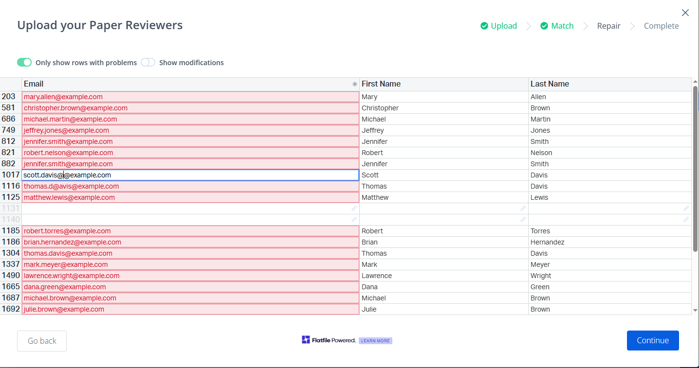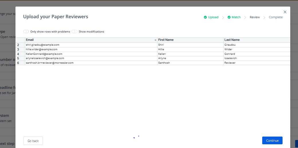Proceedings Manager will allow you to confirm your reviewer set in the UI. This is a great place to look for duplicates or any problems in formatting. Before invitations are sent, organizers can: