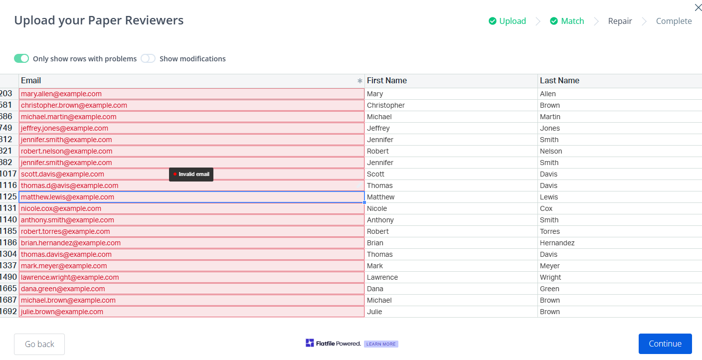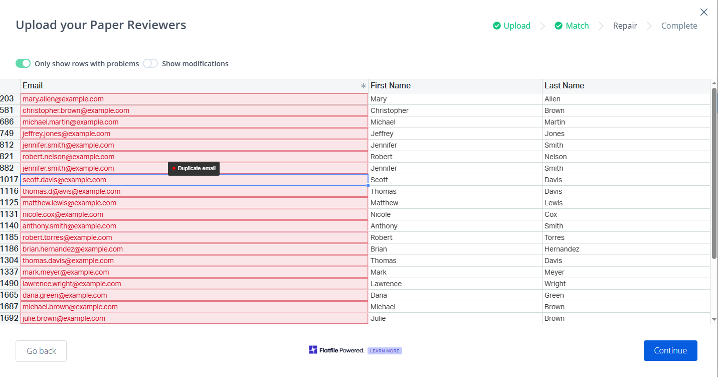 Hover over an email address to identify an issue (e.g. “Invalid email address” or “Duplicate email address”).