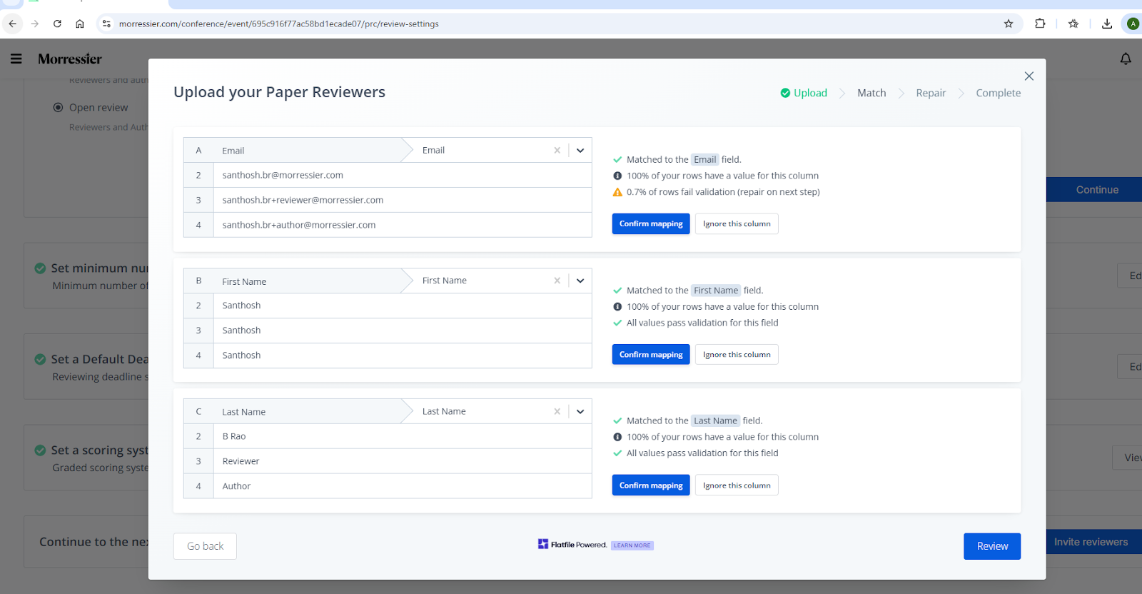 For each field in the spreadsheet you’ll see a result set – in this case for Email address, First Name, and Last Name. You proceed by selecting Confirm mapping, or Ignore this column as you will have a chance to address all issues on the next screen.