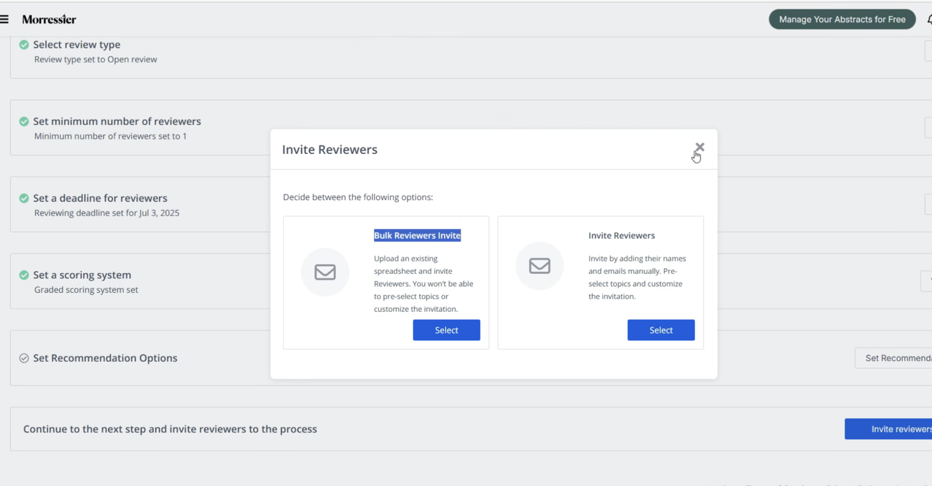 When selecting Invite Reviewers, the organizer will see an option to select either a Bulk Reviewer Invite or an Manual Reviewer Invite.