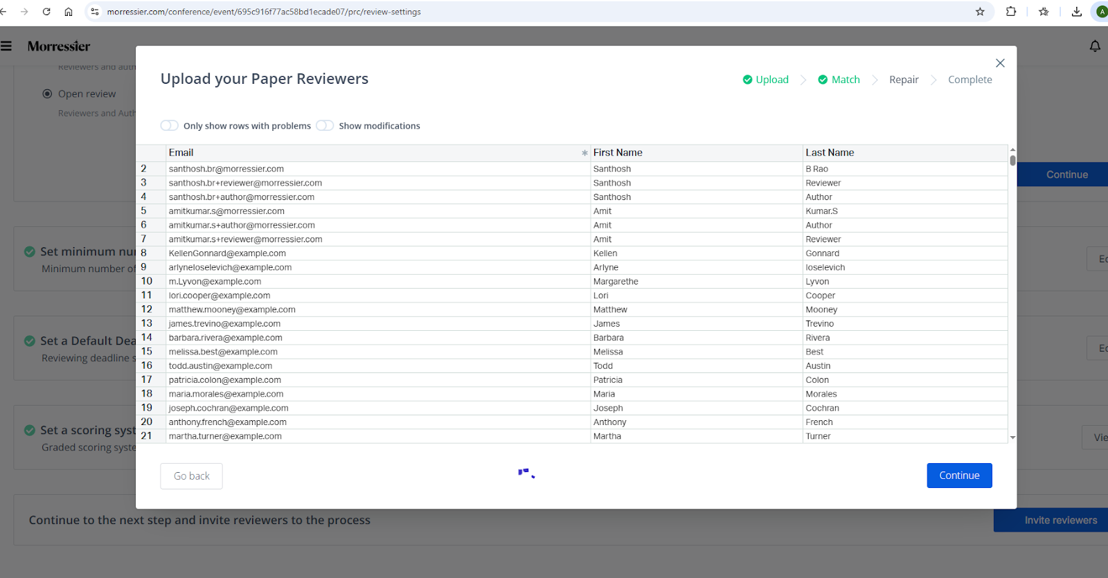 - Remove or exclude any reviewer before completing the import