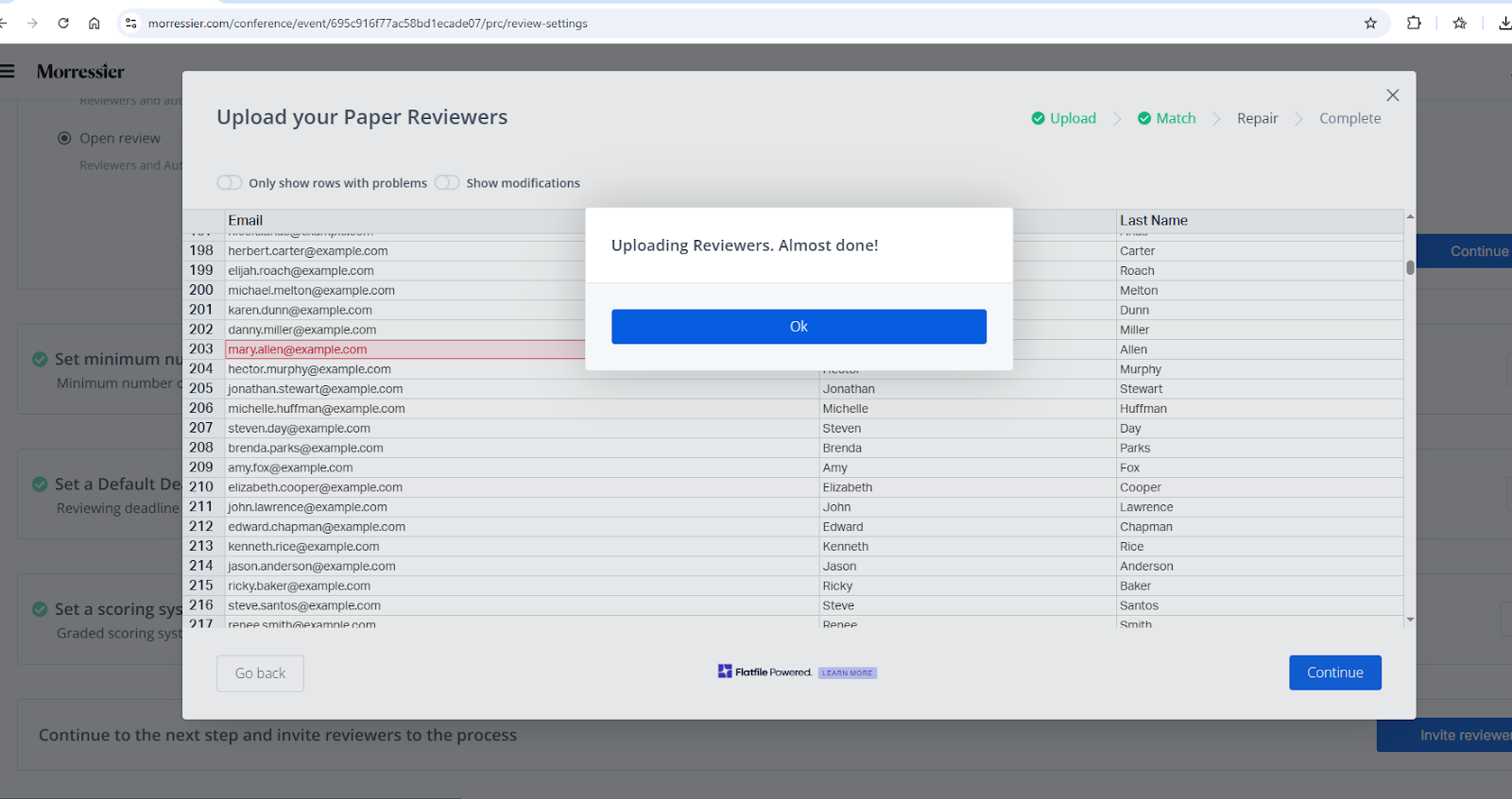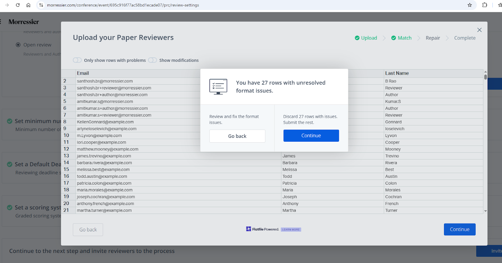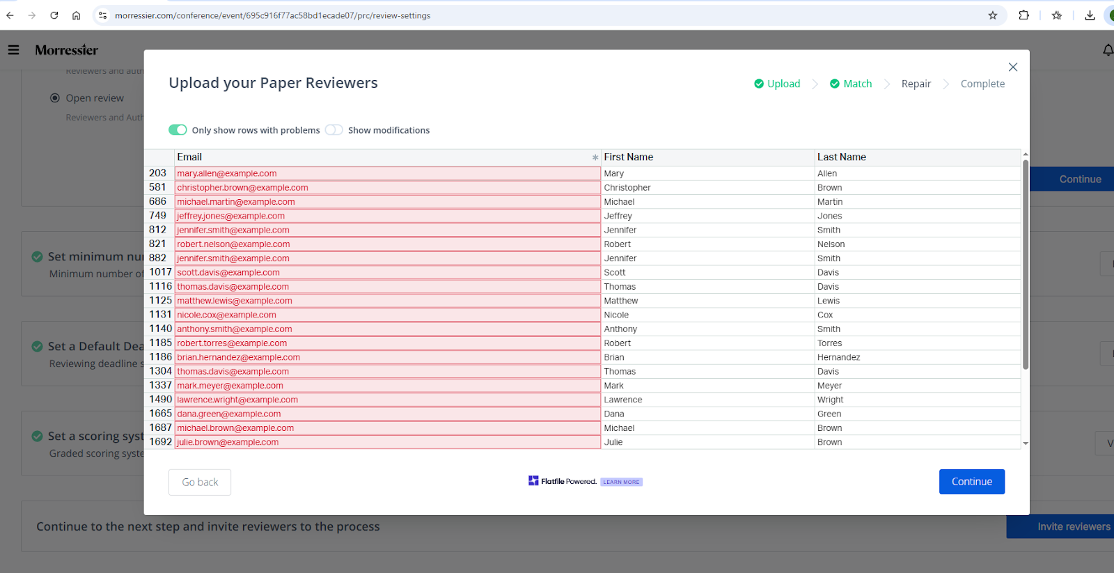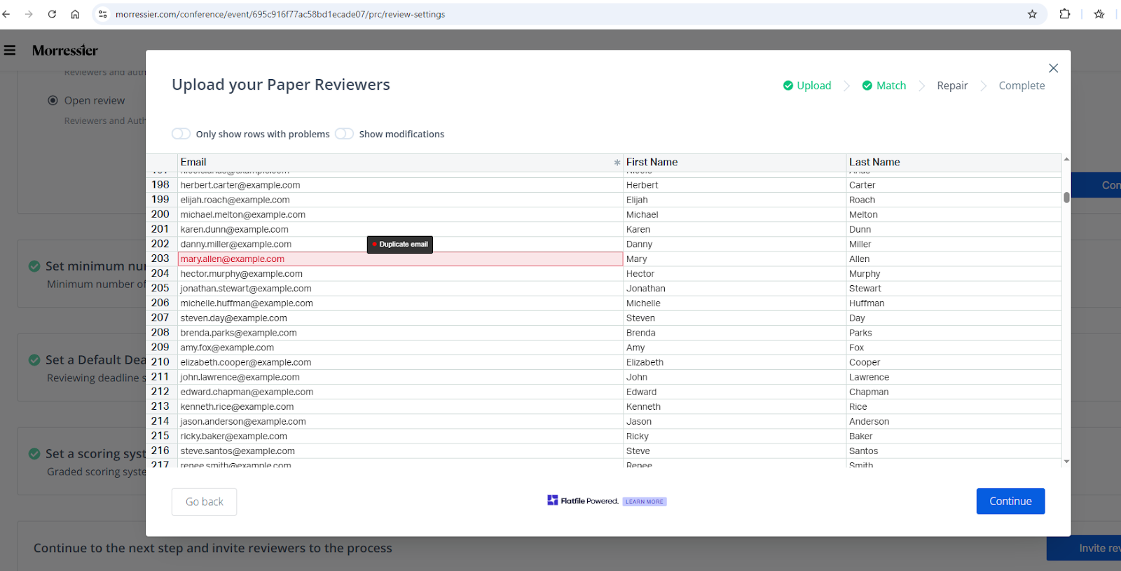 On the next screen you will see all the email addresses, first names and last names. This is the window where you need to verify the accuracy of your invitation list before you click Continue.