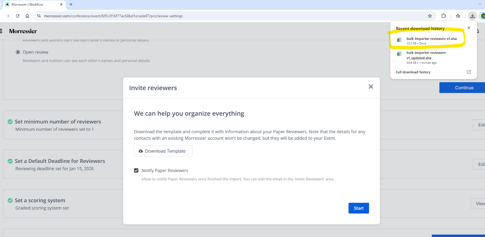 As an organizer, when you select Bulk Reviewer Invite, you’ll next be prompted to download a template to gather the name and information about the reviewer.